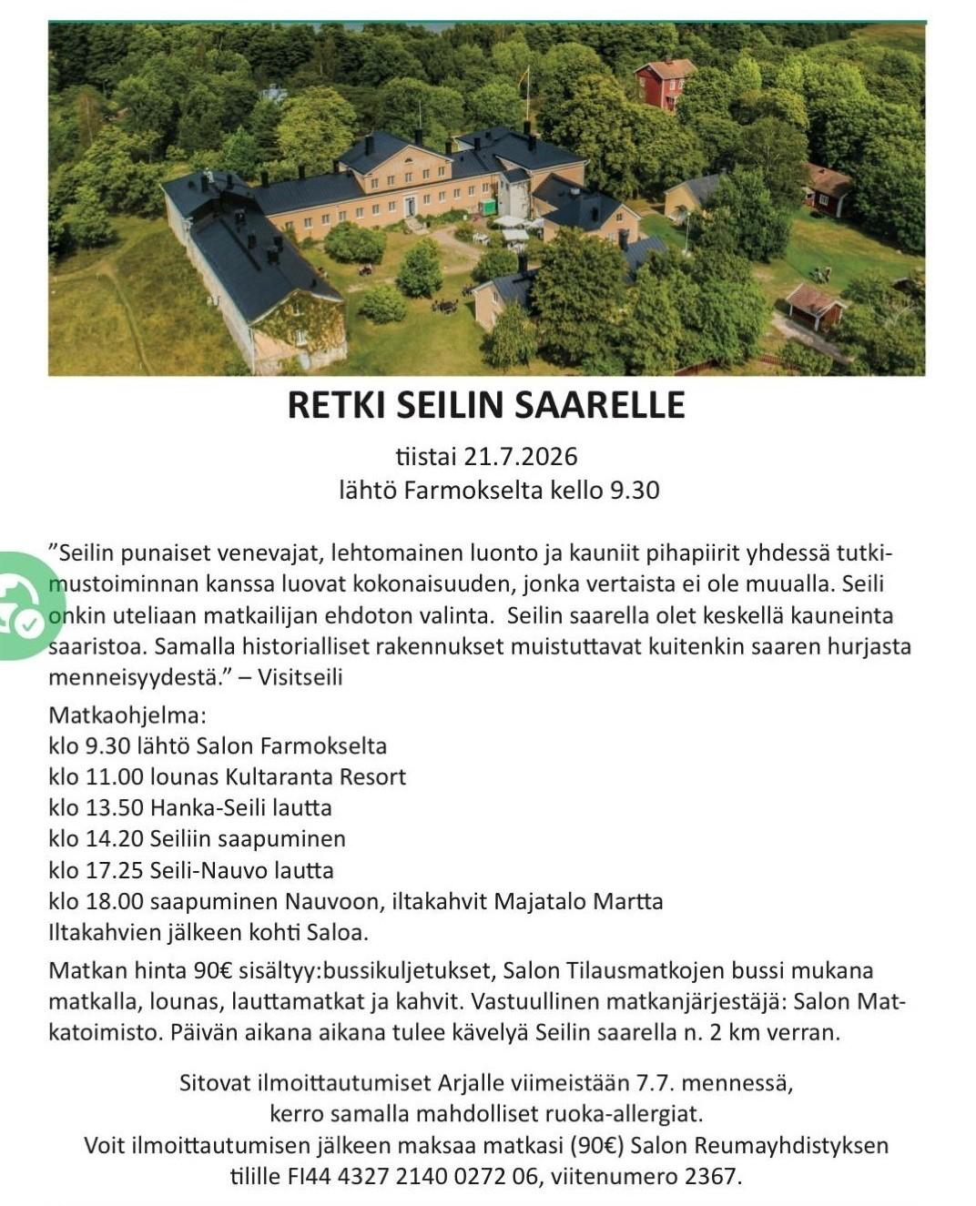 Salon Reumayhdistys ry järjestää kesäretken Seilin saareen. Katso ilmoittautumisohjeet kuvasta!