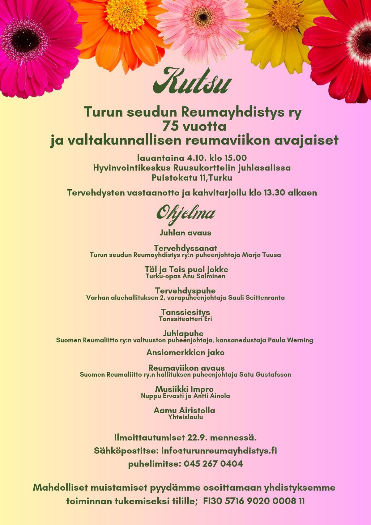 HUOM! Ilmoittautumisaikaa juhliimme ja reumaviikon avajaisiin on jatkettu 22.9. saakka!